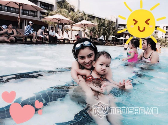 | Mới đây, trên trang cá nhân, Vũ Thu Phương đã chia sẻ hình ảnh bé Anna được mẹ và gia đình cho đi tắm ở hồ bơi. Trong hình ảnh, bé Anna diện bộ đồ bơi kẻ họa tiết hình chú cá Nemo, gương mặt dễ thương của bé tỏ ra rất thích thú, dạn dĩ khi được ngâm mình xuống nước.
